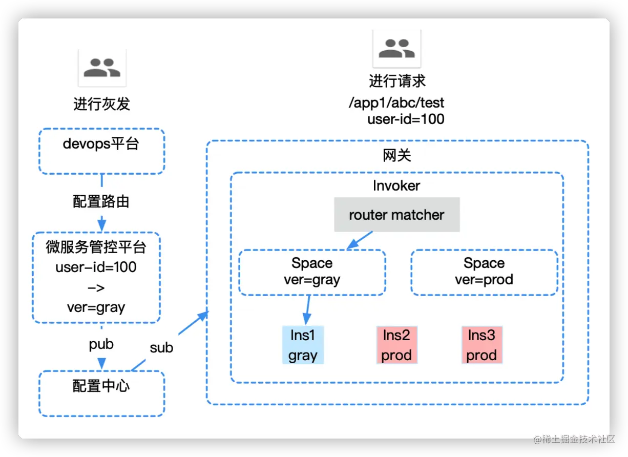 条件路由的功能结合devops平台发布管理可以很容易实现灰度发布。如下图所示我们将用户id是100的请求分发到灰度版本上进行内部测试。