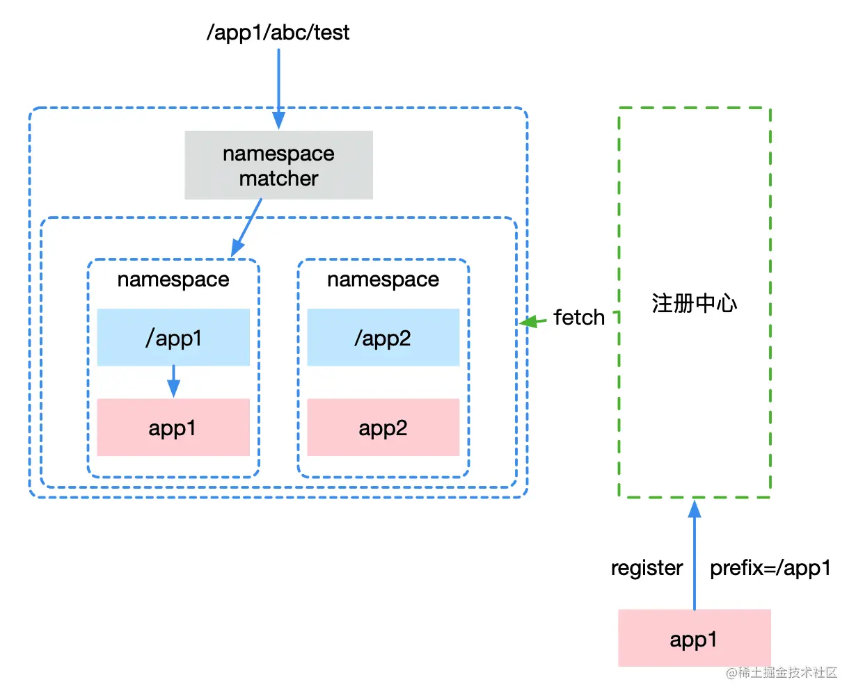 经过一系列url规范化行动后,我们的url目前不同的应用都会采取不同的前缀,同时这个前缀信息会随着应用注册到注册中心。这样网关进行服务发现时会给不同的url前缀以及微服务应用构建不同的namespace对象,在进行请求匹配时候只需根据url前缀选取到对应的namespace即可匹配到对应微服务应用,后续就是现有微服务框架sdk的功能:路由、负载均衡直至完成整个调用。