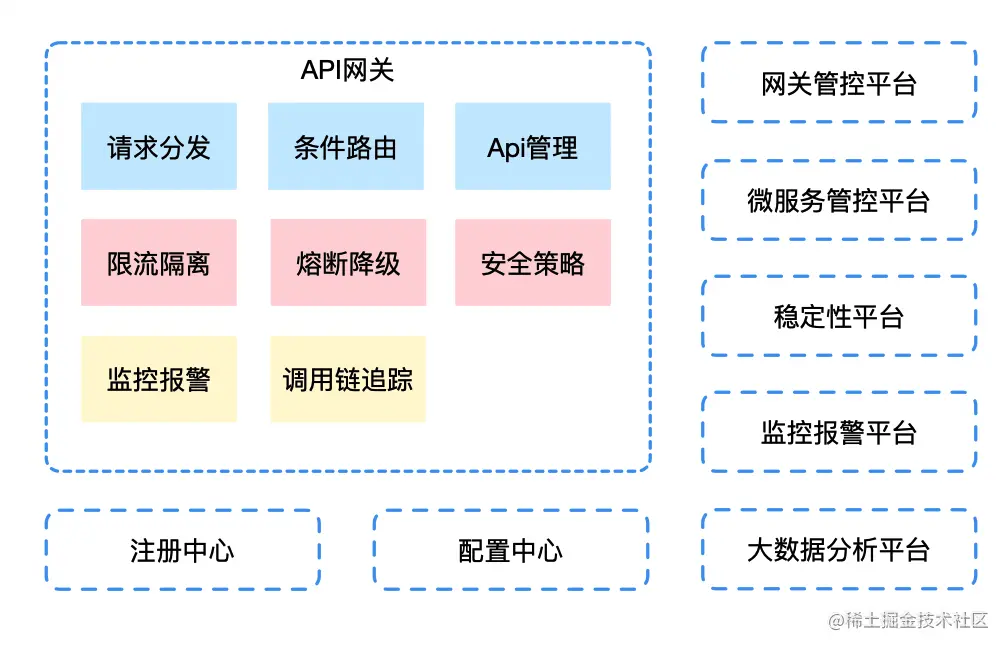 目前Api网关实现的功能包括请求分发、条件路由、Api管理、限流隔离、熔断降级、安全策略、监控报警以及调用链追踪等。