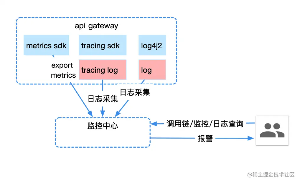 与其他微服务应用一样,我们的api网关也有完善的监控报警、调用链追踪、日志查询等功能。这里监控主要指的是查询metrics信息,调用链主要指查询tracing信息,日志顾名思义就是logging,三者是监控领域很典型的信息了: