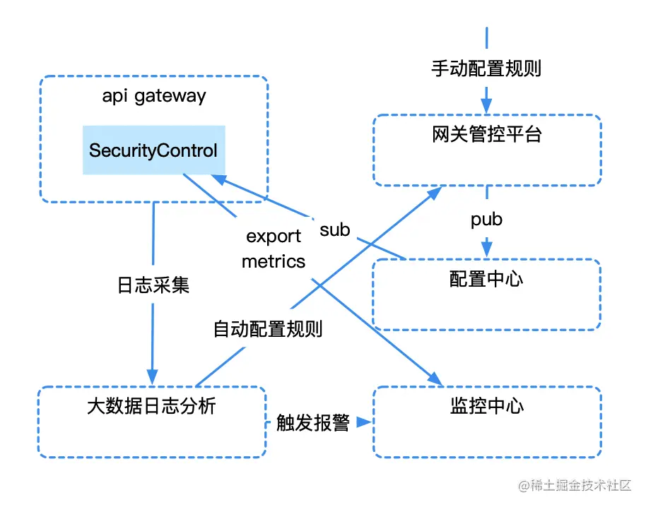 整个安全策略的结构如上所示。用户可以在网关管控平台手动进行规则配置,经由配置中心下发到api网关的securityControl进行热更新。在请求来临时由securityControl判断是否符合规则,被封禁的流量同样暴露metrics数据给监控平台供我们随时查看。