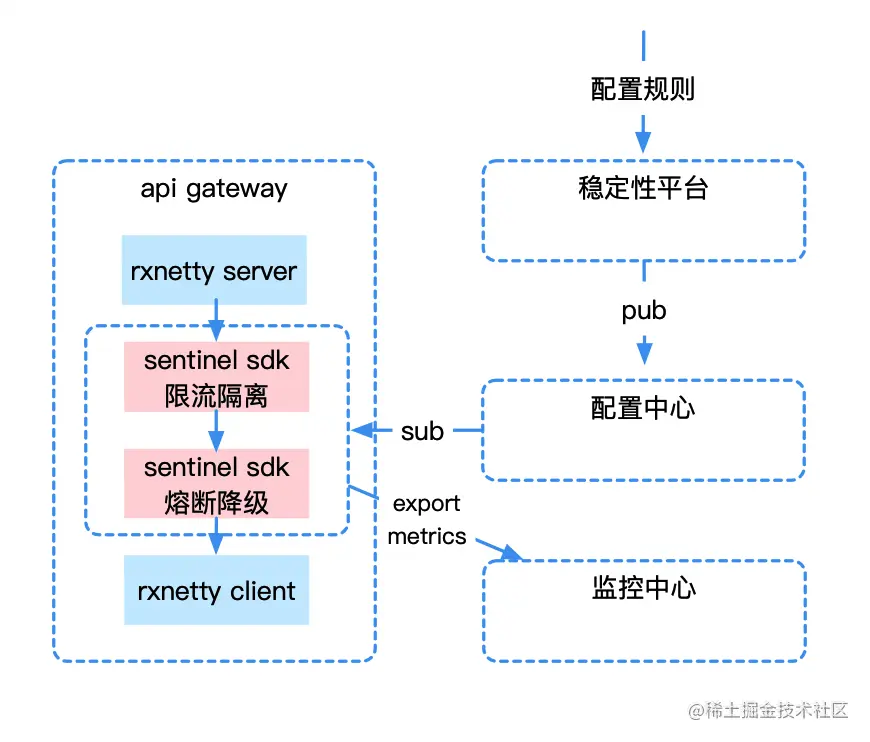 我们的限流隔离/熔断降级均基于稳定性平台与配置中心实现,稳定性平台是我们基于Sentinel二次开发的。整个结构如下图所示: