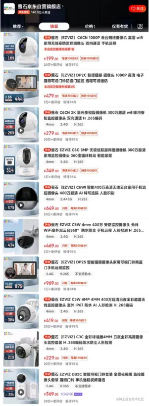 在萤石京东自营旗舰店中,销量最高的前十款产品当中,有七款是摄像头产品,而另外三款智能猫眼,也算得上是视频安防产品。