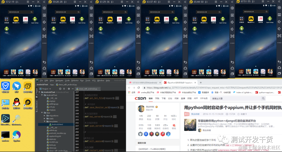 然后就是多设备并发的问题。我记得得多开appium服务,然后指定对应的设备ip和设备端口 还有appiium自身端口。6个设备,那就需要6个appiuim服务端口。但是我忘了命令参数,还有一些坑。所以去百度搜索相关。结果好巧不巧。搜到了一个比较满意的博客。居然是自己16年写的,我说怎么看着思路这么顺眼,居然已经有1.5万的浏览量,可怕。不过看了俩眼发现,除了那句启动命令外,其他的都太青涩了,不值得使用了。