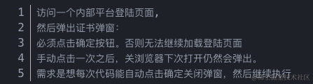 但是这个方法有个前提,就是selenium脚本在运行,也就是浏览器已加载完毕。 但是小章实际测试发现,在证书弹出的时候,浏览器并没有加载完毕,而是在一直缓冲中,这就导致selenium的代码全都被挂起了,别说模拟回车/点击确定了。就连个print此时都无法执行。