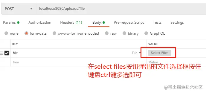 选择多个文件上传,点击postman的【send】按钮发送请求。