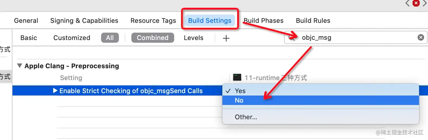 objc_msgSend配置,Enable Strict Checking of objc_msgSend Calls设置为NO,默认值为YES,意思是编译器会检查,objc_msgSend只接收1个参数。此处目的不让编译器检查。