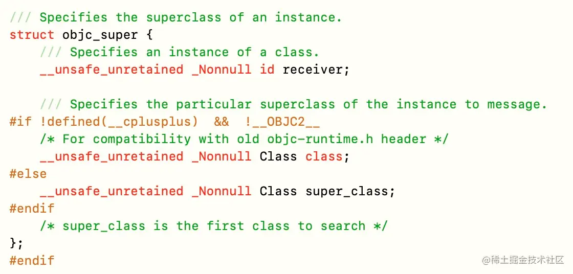 如果想要模拟调用 objc_msgSendSuper 函数,就必须了解其方法参数意义。最主要的还是 super 结构体,结构如下: