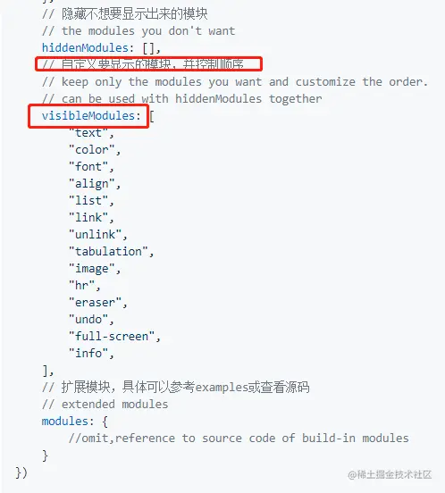 visibleModules: ['text', 'color', 'font', 'align', 'list', 'link', 'unlink', 'tabulation', 'image', 'hr', 'eraser', 'undo', 'full-screen', 'info', 'emoji', 'video', 'upload', 'img'],