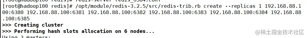 /opt/module/redis-3.2.5/src/redis-trib.rb create --replicas 1 192.168.88.100:6380 192.168.88.100:6381 192.168.88.100:6382 192.168.88.100:6383 192.168.88.100:6384 192.168.88.100:6385