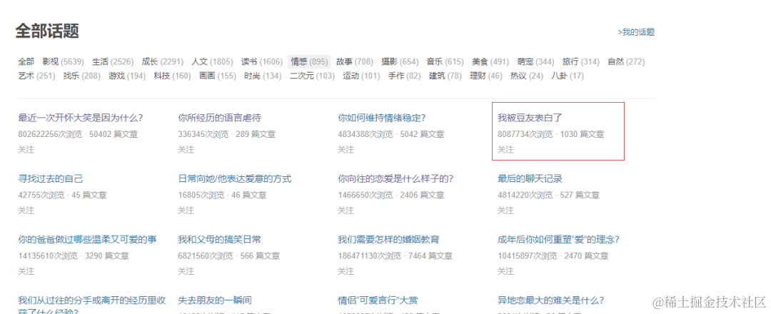 派森酱在刷豆瓣的时候发现,豆瓣上居然还有一个叫我被豆油表白了的交友话题,阅读量居然高达 8087734 次,拥有 1000+ 篇话题,几乎每篇平均被阅读了 8000+ ,看了一下里面的小姐姐照片还挺多的。今天我们就用爬虫把他们下载下来。\