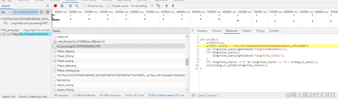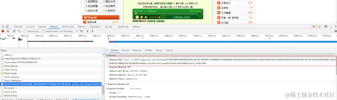 肯定是少了关键性的参数,回到上面 Network 仔细观察 mp3 的 url,发现在 url 后面带了一个 key 的关键字。如下图,这个 key 是来自于 https://img.tingchina.com/play/h5_jsonp.asp?0.5078556568562795 的返回值,可以使用正则表达式将 key 取出来。