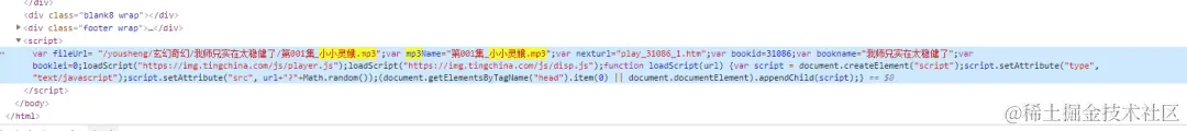 打开单个章节的链接,在 Elements 面板用章节名称作为搜索词,在底部发现了一个 script,这一部分就是声源的地址。