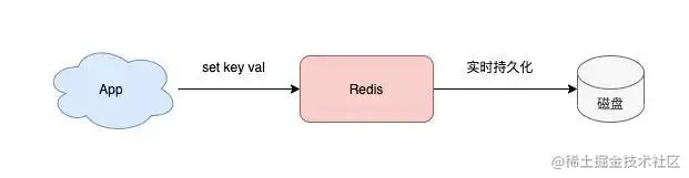 我猜你最容易想到的一个方案是,Redis 每一次执行写操作,除了写内存之外,同时也写一份到磁盘上,就像这样: