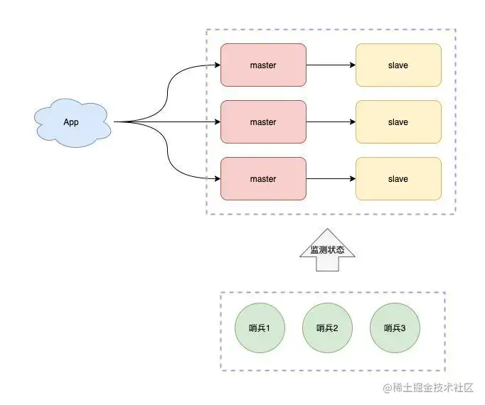 但是这样也有问题,手动提升实例上来,需要人工介入,人工介入操作也需要时间,我们开始想办法把这个流程变得自动化,所以我们又引入了「哨兵」集群,哨兵集群通过互相协商的方式,发现故障节点,并可以自动完成切换,这样就大幅降低了对业务应用的影响。