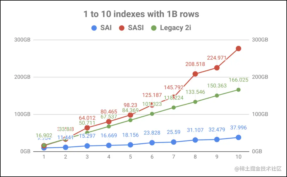 仅仅看一下索引存储,在体积上与表索引的数量相比有很大的改进。为了比较二级索引、SASI和SAI,我们进行了一些基准测试,以显示针对磁盘存储的性能水平。正如你在图2中所看到的,当你扩展索引数据时,用于SASI的磁盘容量会大量增加。