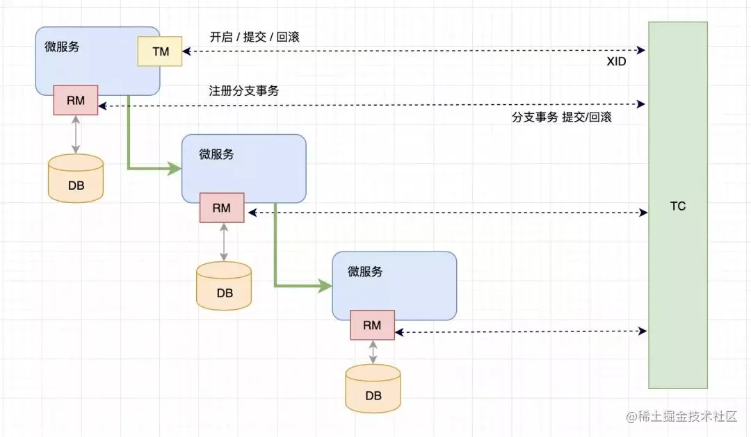 - TM 请求 TC,开始一个新的全局事务,TC 会为这个全局事务生成一个 XID。