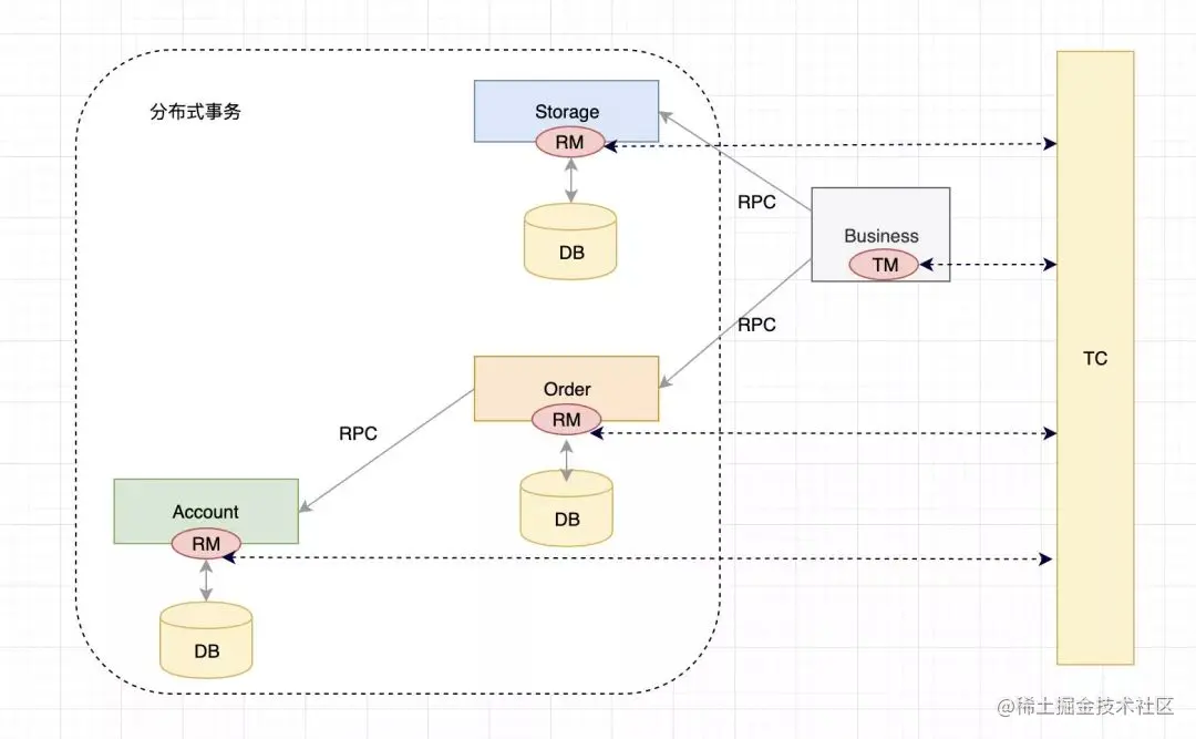 Business 是业务入口,在程序中会通过注解来说明他是一个全局事务,这时他的角色为 TM(事务管理者)。