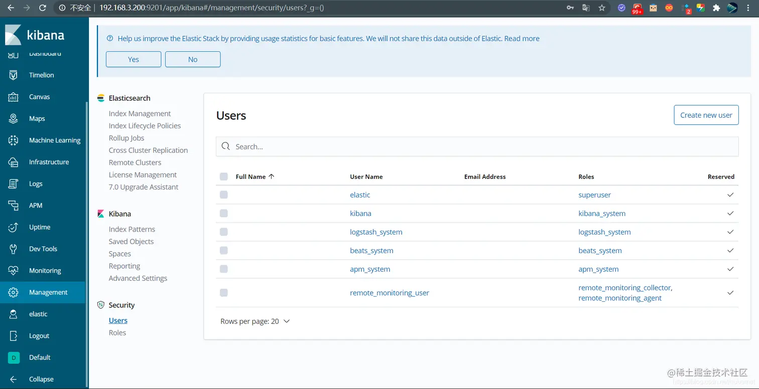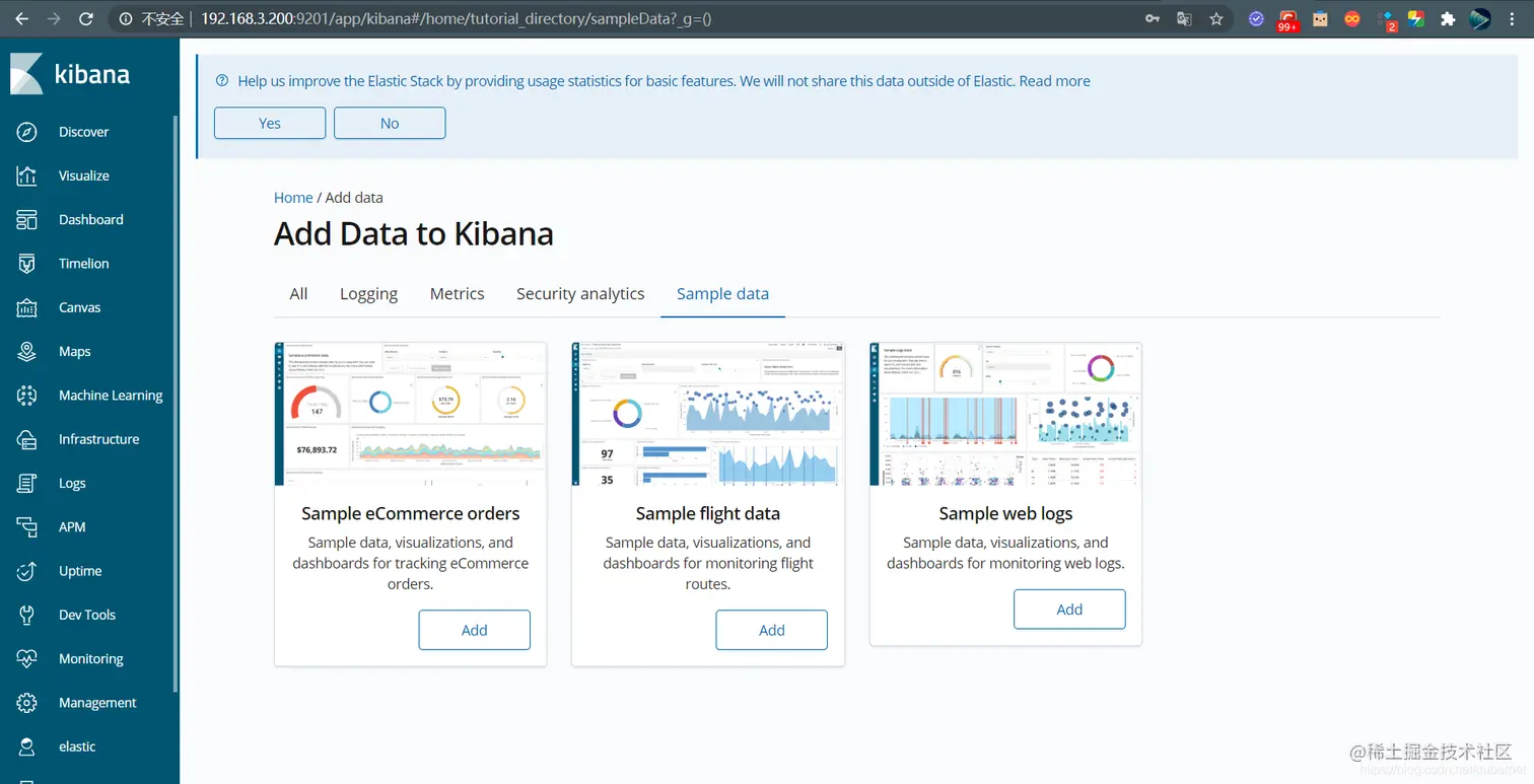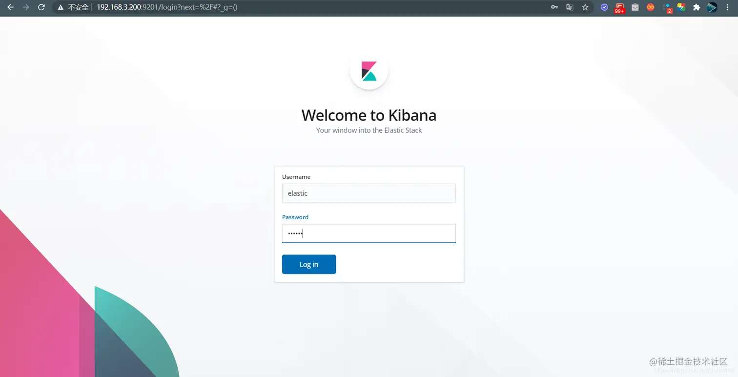 在Kibana服务启动成功后,在浏览器中输入http://localhost:5601即可访问,用户名和密码就是我们刚才配置的elastic和123456。