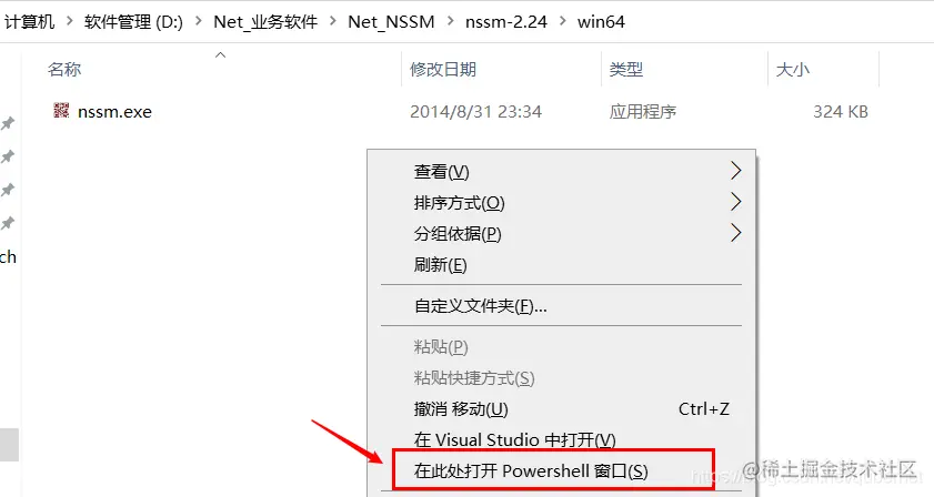 打开NSSM的win64的文件夹,如D:\Net_业务软件\Net_NSSM\nssm-2.24\win64,然后按住Shift+鼠标右键点击文件夹空白处,选择“在此处打开Powershell窗口”
