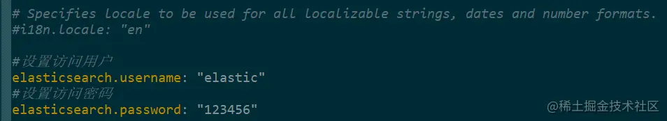 由于在前一篇文章“Windows下安装和配置ElasticSearch”中,我们设置了ElasticSearch的访问用户和密码,所以这里需要配置Kibana访问ElasticSearch的用户和密码,修改安装目录config中的kibana.yml文件,具体修改如下: