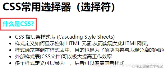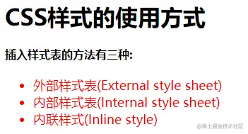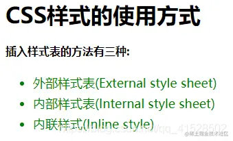 <li>样式通常存储在样式表中,目的也是为了解决内容与表现分离的问题</li>