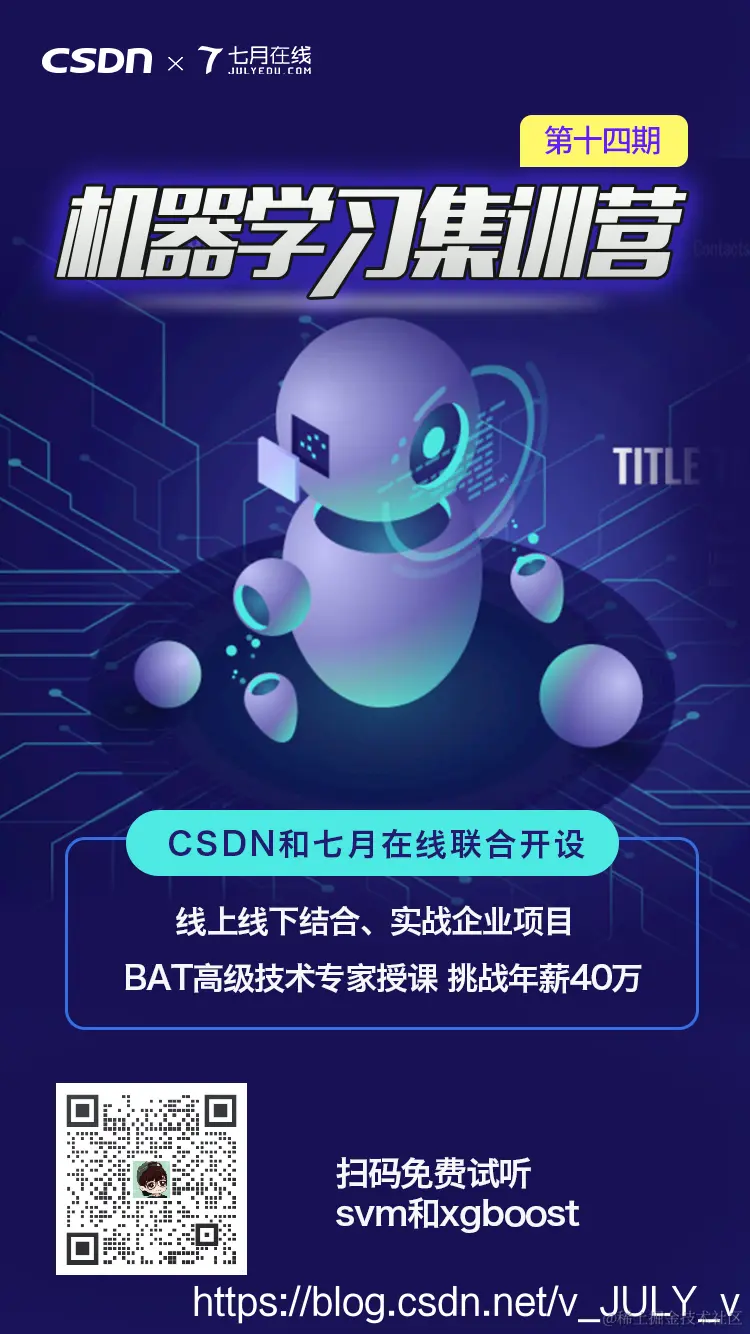 July我插一句,想免费试听集训营(集训营最新一期由七月在线和CSDN联合开设,详情点击:edu.csdn.net/topic/20201…)里svm与xgboost内容的(讲得非常透彻,胜过无数资料),可以添加此企业微信,添加时备注:集训营免费试听