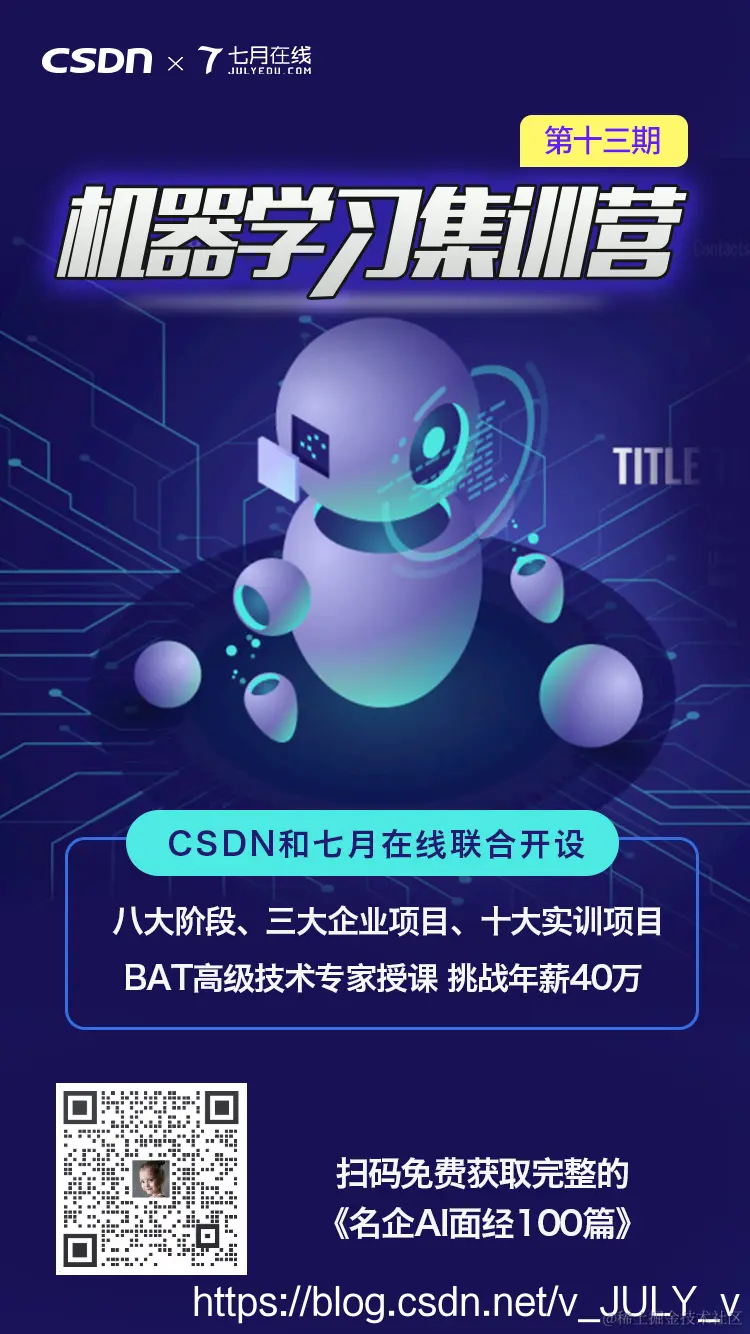熟悉我的朋友可能已经知道,我个人从 2010 年开始在CSDN写博客,写了十年,如今接近1700万PV,创业做「七月在线」则已五年,五年已30多万学员。这五年经历且看过很多的人和事,比如我们的机器学习集训营帮助了超过1000人就业、转型、提升,他们就业后有的同学会分享面经,当看到那一篇篇透露着面经作者本人的那股努力、那股不服输的劲的面经的时候,则让我倍感励志。比如“双非渣本三年 100 次面试经历精选:从最初 iOS 前端到转型面机器学习” 这篇面经,便让我印象非常深刻。在佩服主人公毅力和意志的同时,也对他愿意分享对众多人有着非常重要参考价值和借鉴意义的成功经验倍感欣慰。