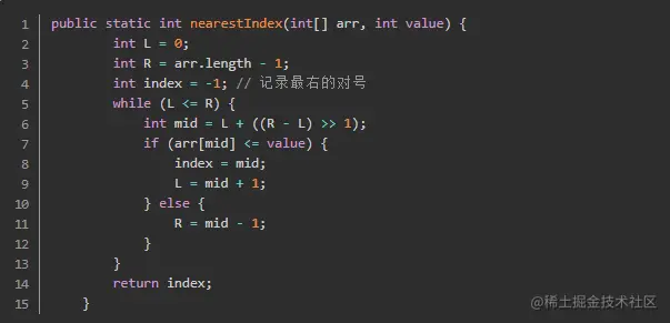 在一个有序数组中,找小于等于某个数最右侧的位置 .png