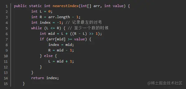在一个有序数组中,找大于等于某个数最左侧的位置 .png