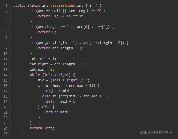 3、通过二分法来验证除首位和末尾位置的数组数据的局部最小值,若某值左右两边的值都大于该值,那么该值就属于局部最小值;否则继续通过二分法进行查找。