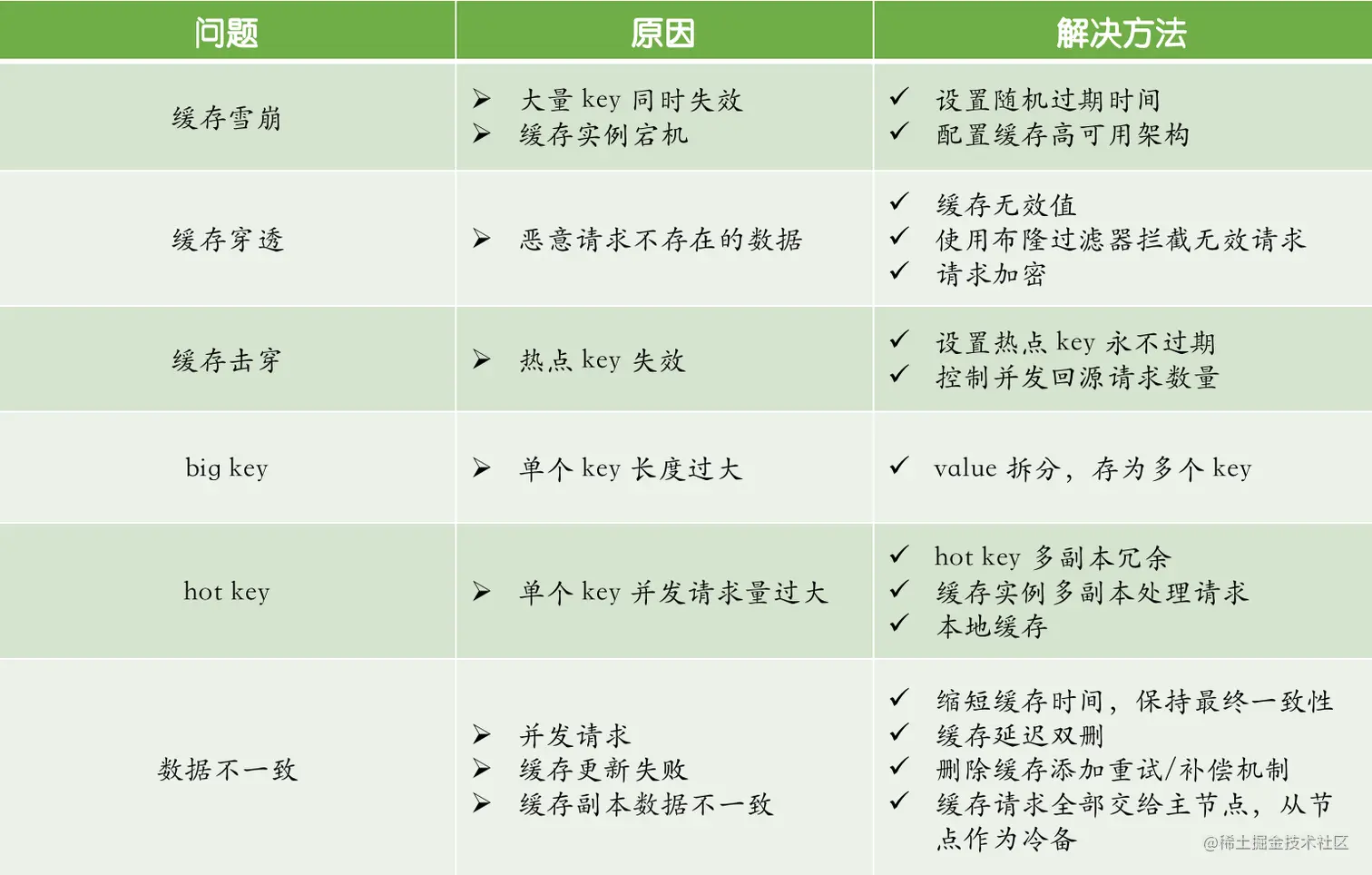 以上向大家介绍了六种常见的缓存问题和解决方案,其实在了解到原因之后解决方案也就顺理成章地出来了。最后我们用一张表格来给大家做个简单的总结吧: