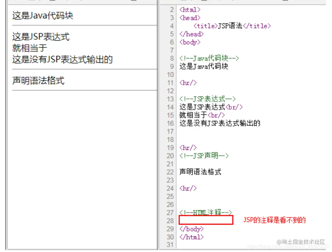 jsp的注释不仅可以注释java程序片段,也可以注释html元素,并且被jsp注释的部分不会参与翻译成.java文件,也不会在浏览器上显示。