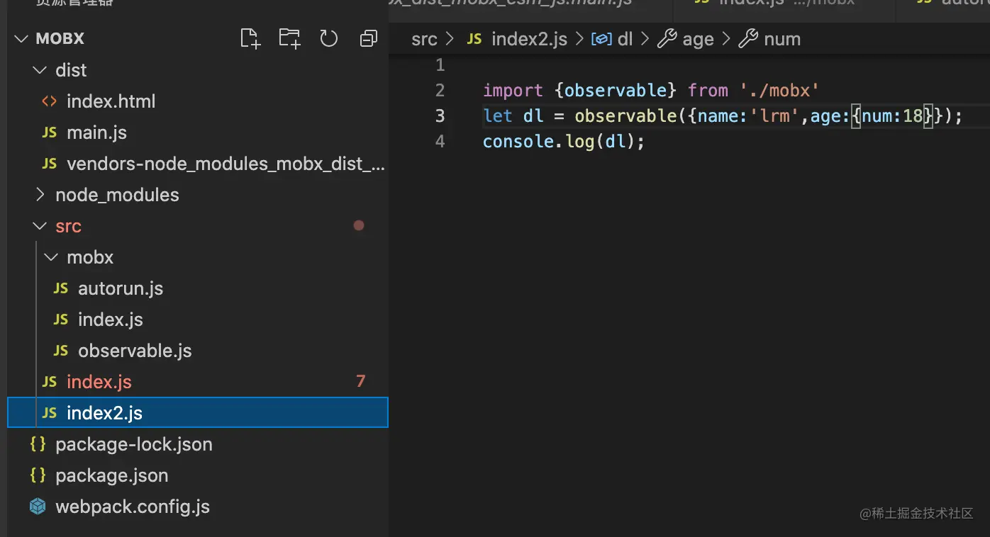 手动引入自己创建的mobx的index文件,引入创建的observable文件