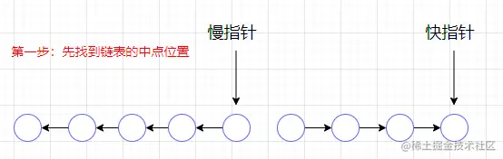 快指针每次前进两个单位,慢指针每次前进一个单位并修改其next节点指向前一个节点,所以当快指针到达链表末尾的时候(空节点或空节点的前一个节点),慢指针刚好在中间,如下图所示