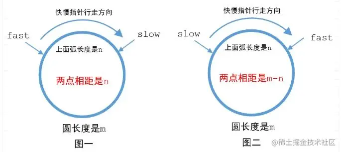 快指针每次走两步,慢指针每次走一步,所以每走一次快慢指针的间距就要缩小一步,在图一中当走n次的时候就会相遇,在图二中当走m-n次的时候就会相遇。这样就解释清楚了读者的疑问了。
