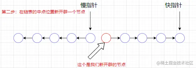 此时慢指针继续向后走,同时开辟一个新节点往前走,看下图
