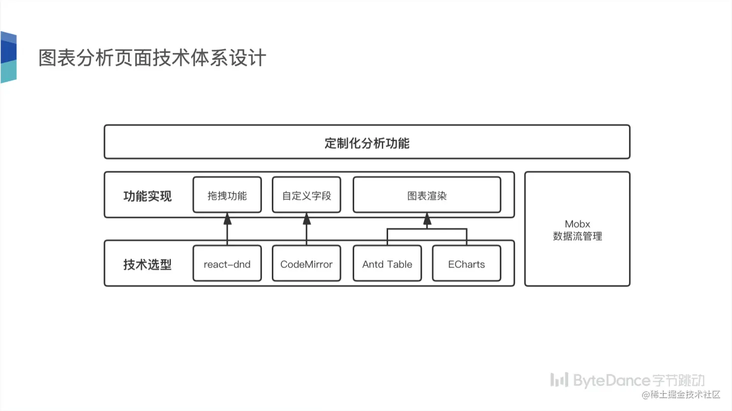 当然我们的这样一个定制化的分析的页面,核心肯定还是我们的图表展示。我们可以基于 antd 的 Table,去实现 Table 类型的像比如交叉表这类的数据呈现,并且我们可以使用 ECharts,来实现像图表类的数据呈现。 我们可以选择 Mobx 作为数据流支撑,因为它很“灵活”,至于为什么,咱们来看下面这张图: