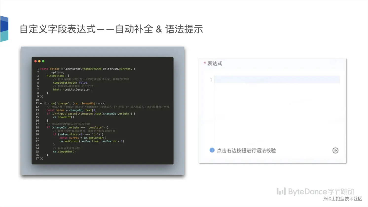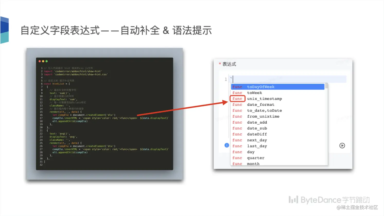 不仅如此,CodeMirror 还支持让我们自定义语法提示菜单。我们只要准备好待提示的 List,在用户输入或者粘贴的时候,filter 好 list 喂给 CodeMirror 就行了。借助每个 list item 的 render 方法,我们还可以自由定制下拉菜单里的样式,开发起来起来就像使用 Echarts 或者 Antd 这样的组件库一样舒适。