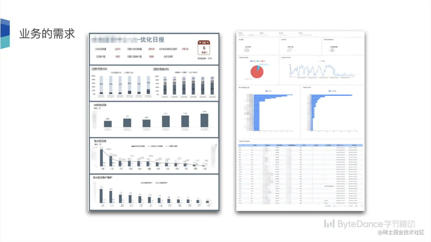 而我们,恰好在做这样一件事情。因为我们是商业化大部门下的团队,所以在我们的大部门中,沉淀了很多有意义有价值的数据,比如我们的一些销售业绩、或者是一些客户数据。为此,在我们的部门下,也聘请了很多专业的数据分析师同学,亦或是销售自己,平时可能都会做一些报表、周报,用以汇总数据,观察趋势,就如下面的这张图所示,左侧的日报图,就是我们业务中实际产出的报表,我们的同学可能会做一些日报类的报表,用以披露部门内的一些销售业绩动态。他们会自己通过 Excel 等工具,在拿到数据后自己绘制各种各样的图表,然后像这样组装起来,再发送出去。而右侧的报表图,就是我们的同学使用了我们研发的系统后,自己组装完成的报表,效果也符合他们的预期。