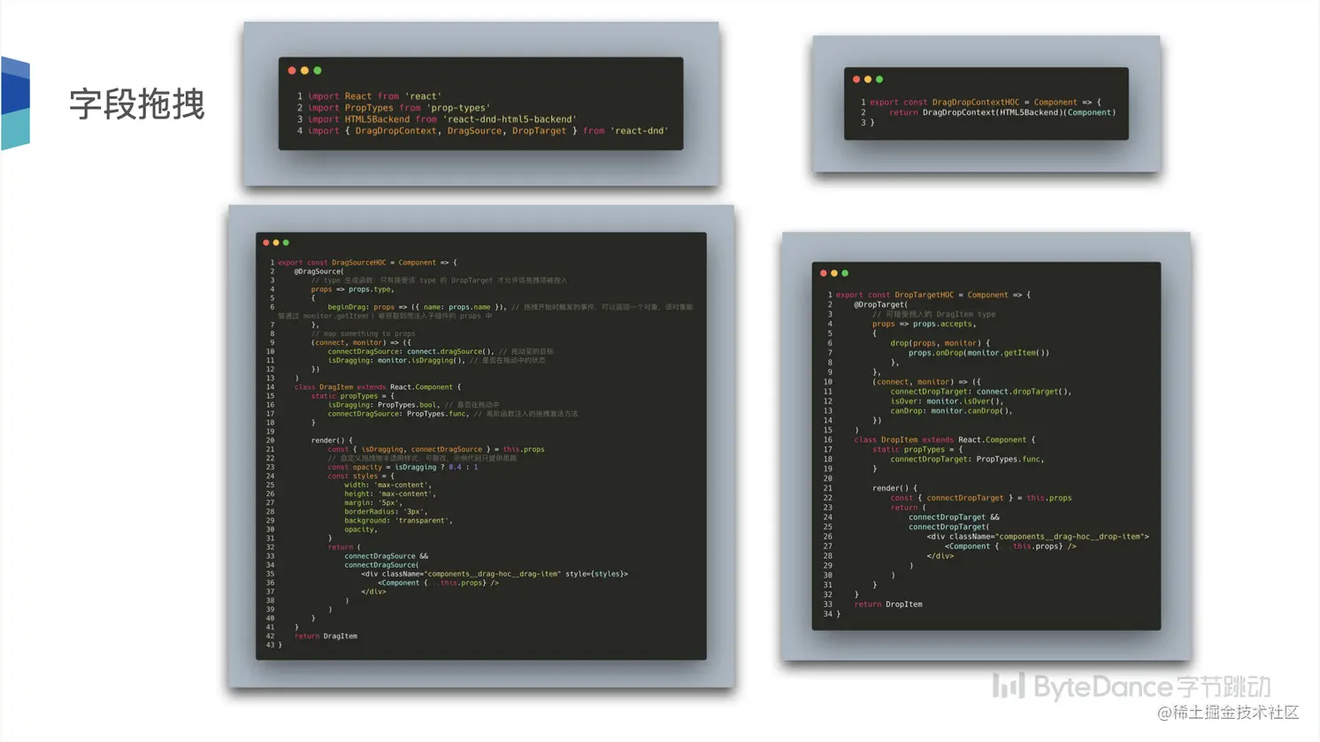 那要如何用实际的代码逻辑实现拖拽三要素呢?我们可以借助 react-dnd 为我们提供的 DragSource 和 DragTarget 方法,对我们的组件进行包装即可,我们只要定义好可拖拽的类型、拖拽事件的回调、亦或是我们想要自定义的能力,比如图中所述,我们对拖拽中的元素会赋予特定的样式 —— 透明度增大,就能完成一个拖拽要素的封装。
