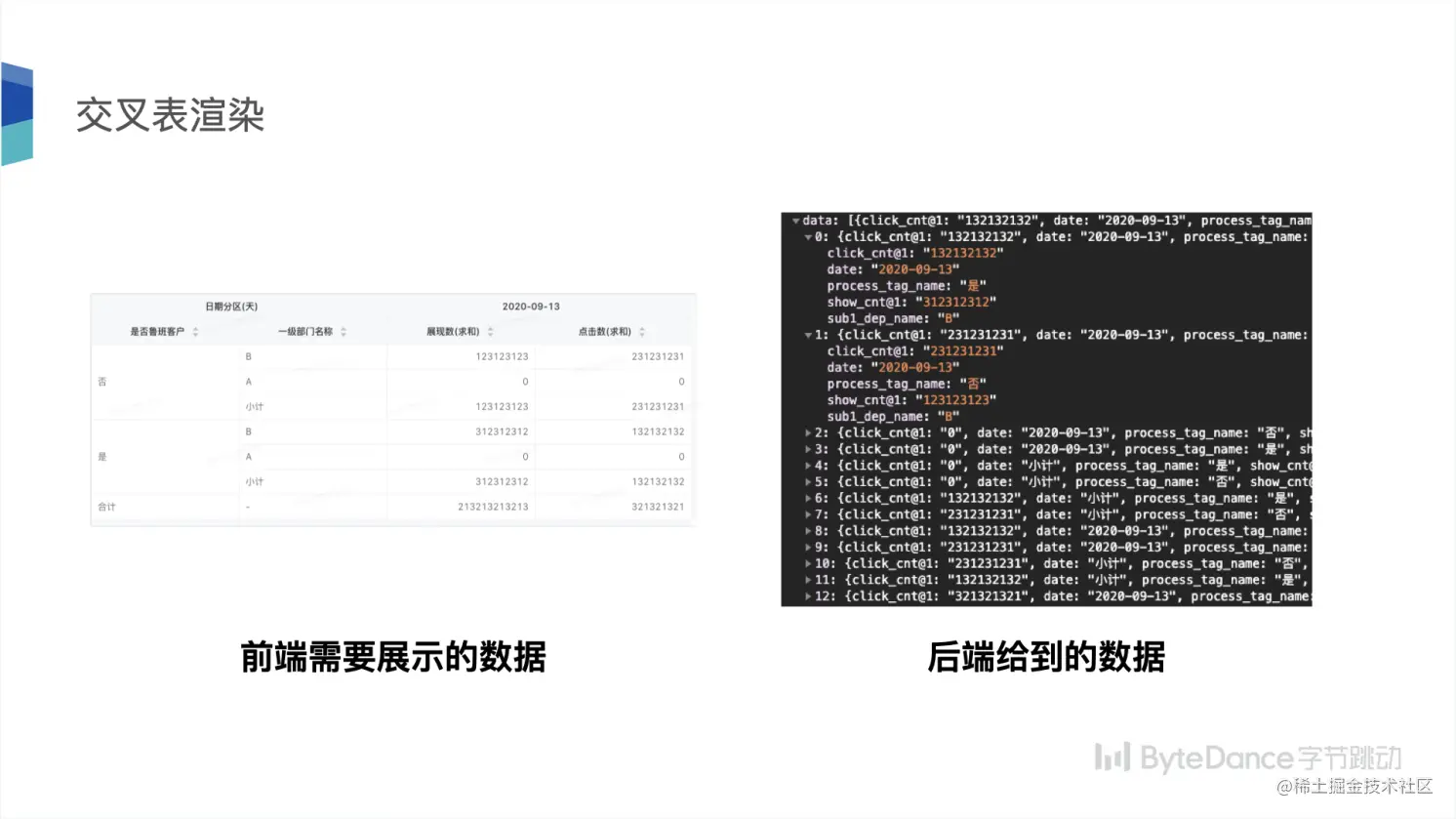 有了字段,自然就可以从后端查询数据啦。那对于前端来说,我们最终要渲染的是如图所示的这样一张交叉表,很明显我们需要的是结构化的数据,而后端直接将字段通过 SELECT 查询出来的结果数据一定是铺平的,从接口响应到数据渲染,必然会需要有个数据格式化的过程。那这个过程谁去完成呢,如果前端来做,对服务器性能更友好,后端就不需要关注数据格式化,可以专注在数据分析而查询,而如果后端来做,对我更友好,哈哈,开个小玩笑。当然,肯定是极致的性能更为重要。那数据格式化我们有怎样的思路呢?