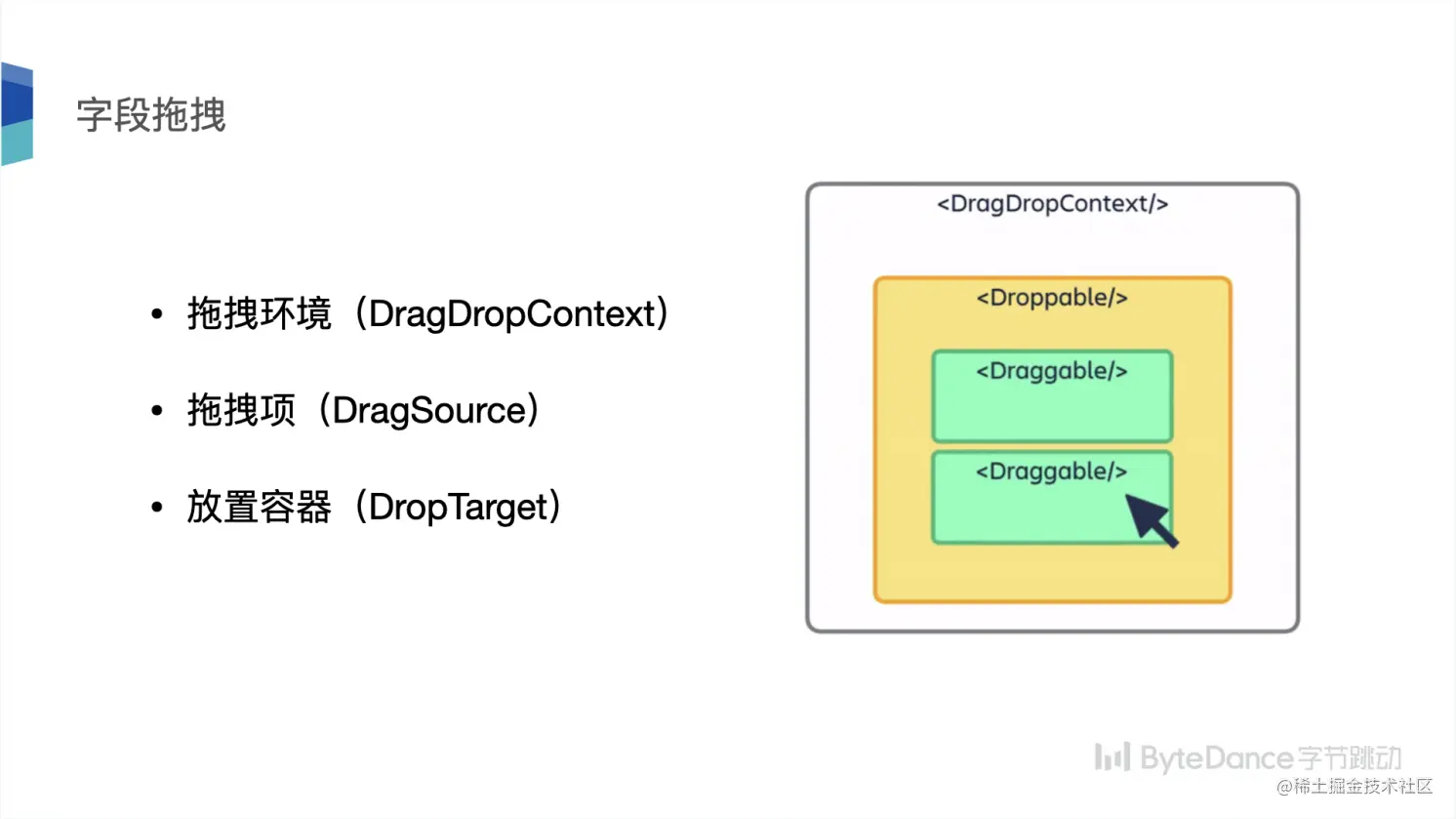 回到主题,我们想要实现一个拖拽能力,核心就是把握住 PPT 上的拖拽三要素,因为不论你的业务逻辑是什么样,这三个要素始终是你所有功能的基点: