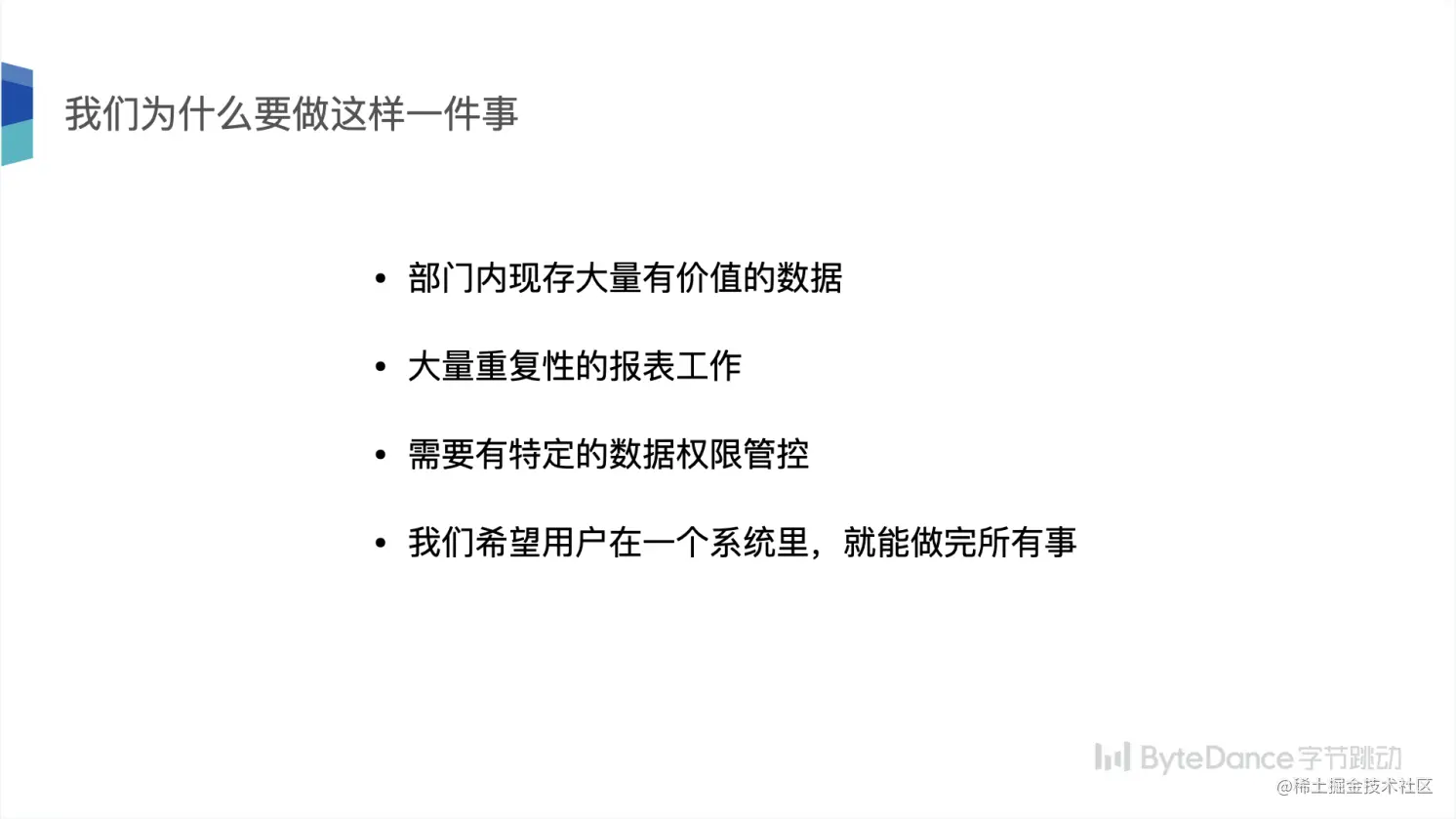 这是咱们今天分享的大纲:我会逐步带着大家切入咱们要开发一个报表系统的几个核心细节,带着大家从业务实际需求场景入手,一步步完成一个前端商业报表系统的搭建。其实我今天准备了五十多页的 PPT,因为做一个 BI 系统有太多有意思或者说值得去讲的东西了,我很希望把所有的都分享给大家,但因为时间关系,我可能只能抽出其中一部分,因此我尽可能让它们能更加通俗易懂,并且我会更多地专注在前端的一些主要功能的实现思路,当然一个 BI 系统肯定远远不止这些。整个分享的过程或许会比较漫长,希望今天来听我的分享的同学,听完之后也都能有所收获。