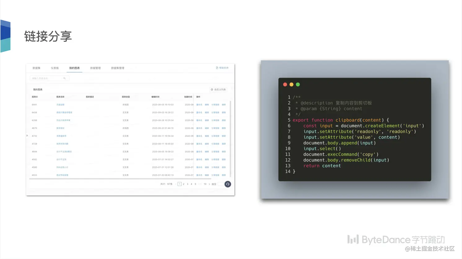 - 链接分享:比如用户直接 copy 了浏览器地址栏里的系统链接,或者是我们的页面里有个按钮叫做类似“复制链接”,用户点击以下,就能自动把图表的链接复制到剪切板中,这样就能将他自己做的图表或者报表直接分享出去;
