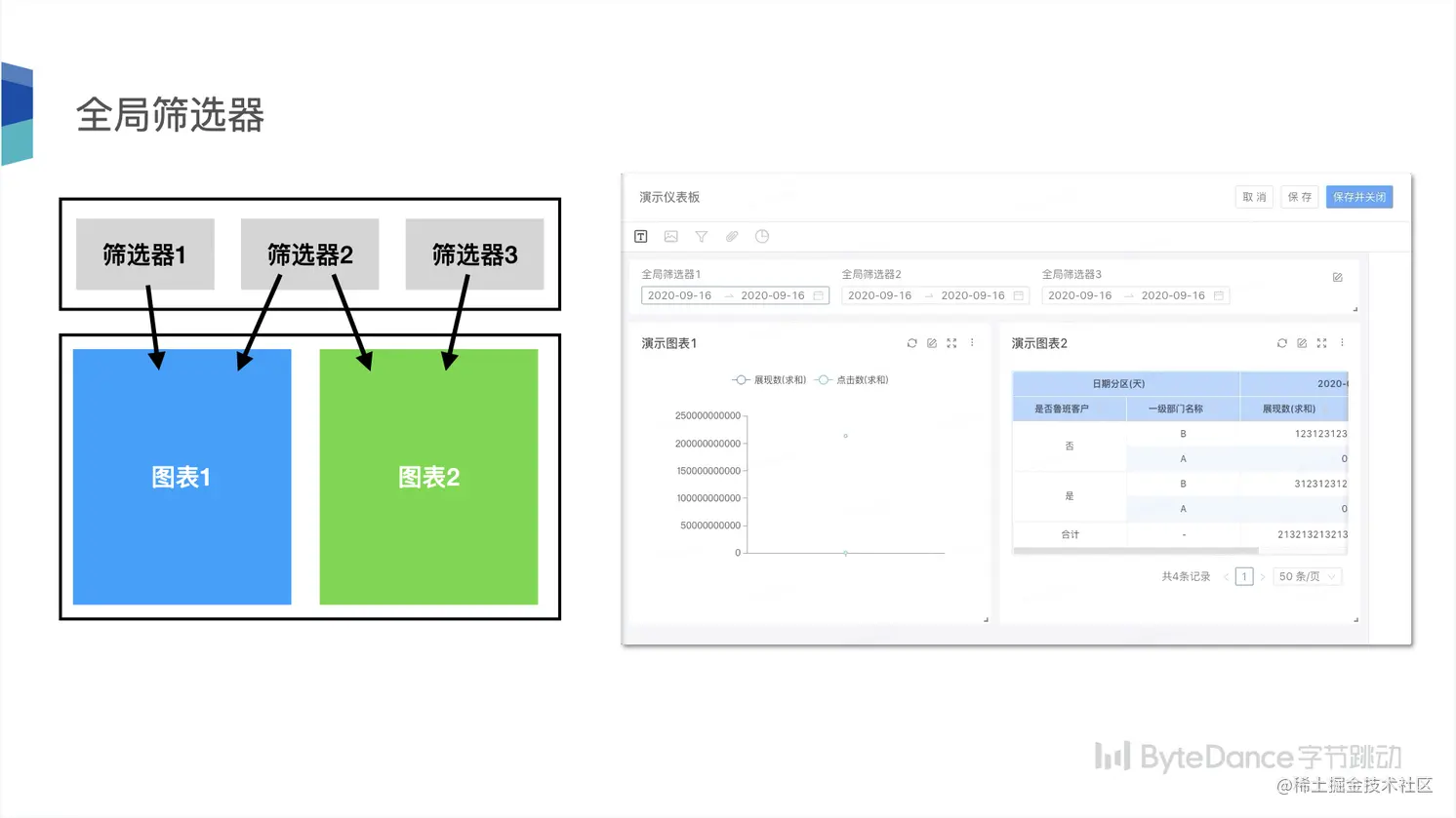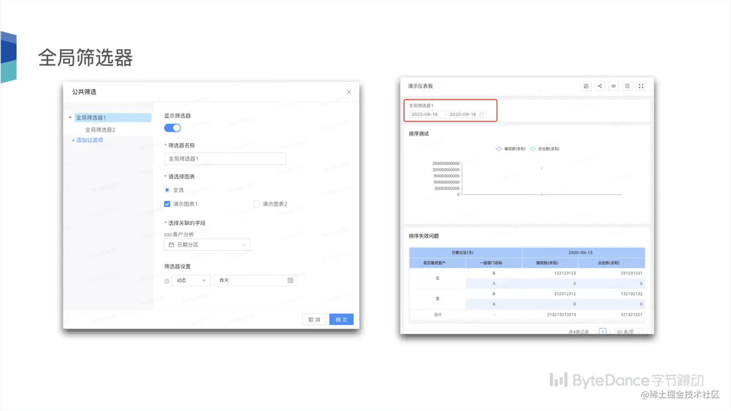 全局筛选器对于一份 BI 仪表板而言是再常见不过的一个功能了,很多时候,我们都会提供一个仪表板层面的筛选器,供给用户自定义筛选数据的能力。筛选器可以与任一图表相关联,并且这些筛选项也只会对关联的图表生效。