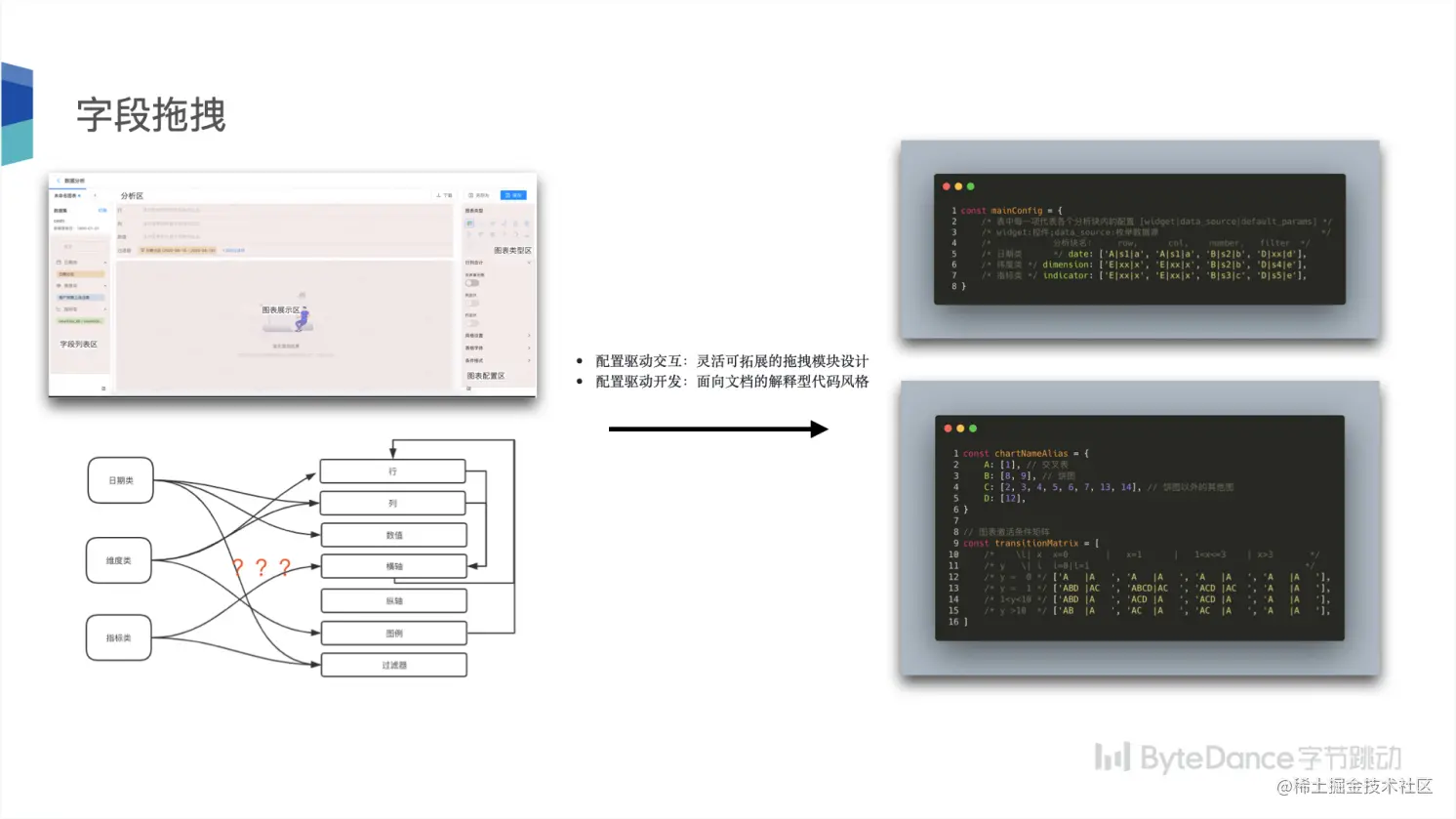 我们可以用很多判断去堆砌,但怎样才能更优雅地去维护这块的逻辑呢?其实细心的同学可能发现了,我们将字段拖入分析区的结果,其实是一个二维的过程,它取决于字段的类型和拖拽终点的类型,因此我们使用一个矩阵来表述这样的过程,矩阵最终的求值,就对应着不同情况下,我们所需的组件和配置。比如我们右侧这样一个示例代码,我们把日期类这样一个字段,去拖入到我们这样的一个行中,它就映射到了我们这样的一个矩阵中的 date 字段下的第一项,然后这个配置就是对应着字段最终要产生的组件,还有它数据初始化元信息或者说一系列的配置信息。
