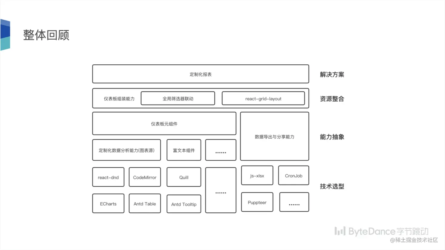 所以我们再整体回顾一下我们刚刚讲完的内容,我们也可以借助业内优秀的实践作为我们的技术底层实现,快速支撑起我们的报表系统的技术选型和基建,再将各种各样的技术抽象成通用的能力封装,创造出我们的定制化数据分析能力(提供了图表来源)、仪表板原子组件(提供仪表板的必要组成元素)以及数据导出分享能力(支持 BI 系统的必要功能),最终再将我们所拥有的资源进行整合封装,就产出了我们提供给用户的定制化报表解决方案。