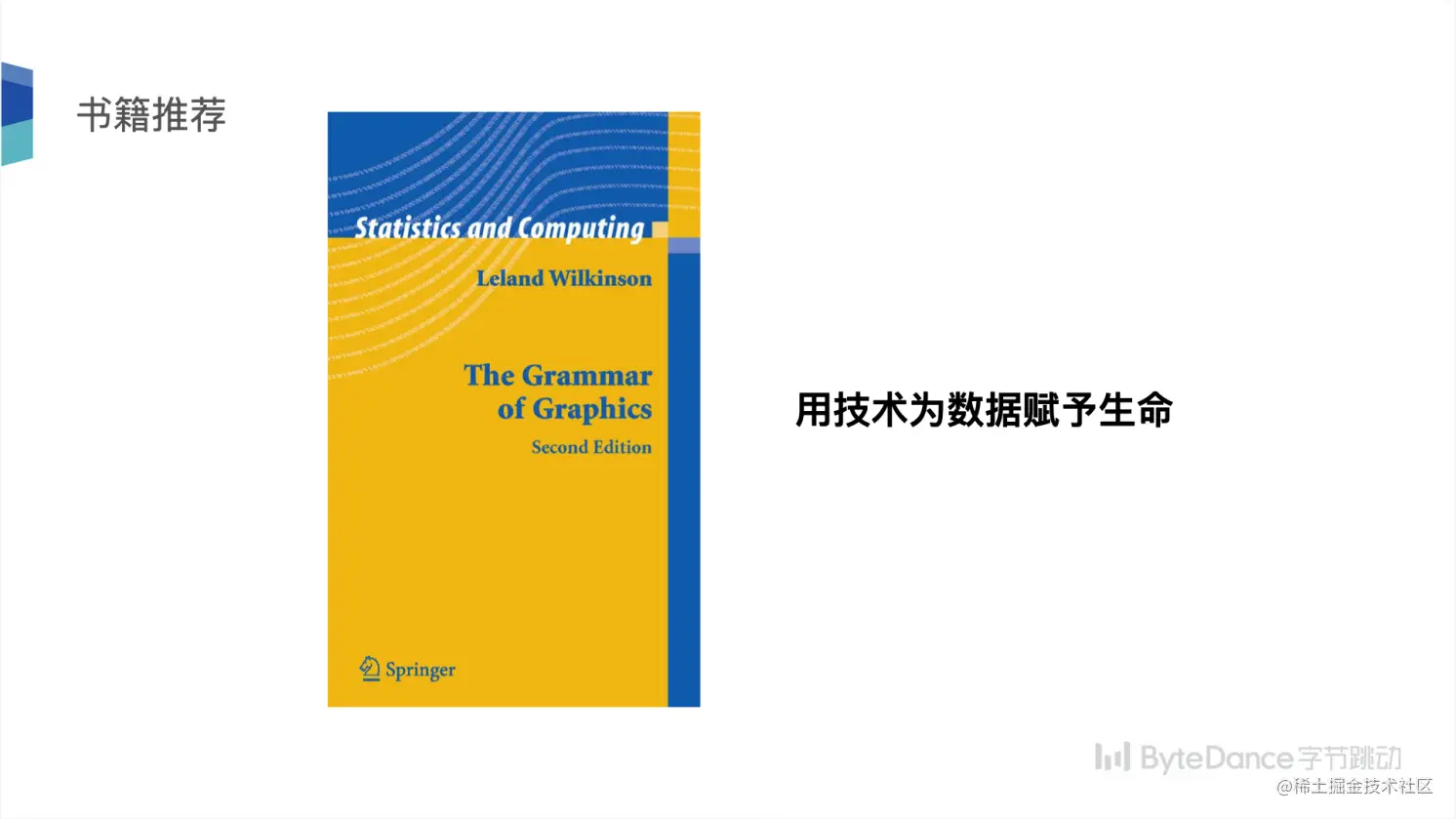 然后前端早早聊有一个惯例,就是每次分享的嘉宾都需要分享一本书,这里我推荐的就是这本《The Grammar Of Graphics》,当时 D3.js 的作者,就是看完了这本书之后,有了灵感,写出了 d3.js 这么优秀的框架。但其实我更想表达的,就是在 BI 系统的这段历程下来,我更深刻地理解到:做一个商业分析系统,最重要的事不是攻克哪些技术难点,而是要善于去发现数据的价值,用技术为数据赋予生命。因此我觉得这本书,再合适不过了。