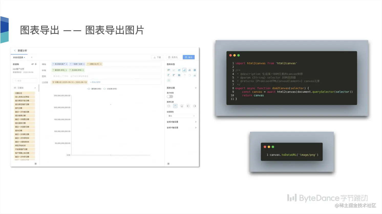 而对于图表类型的图表,熟悉 canvas 的同学可能就会比较亲切了,canvas 提供了一个名叫 toDataURL 的 API,能够快速将 canvas 内的内容导出一份 base64 数据。而对于一些非 canvas 的元素,比如我们的指标卡图表,他可能就是一个纯粹的 Card,我们也可以使用 html2canvas 快速将它变成一张图片。